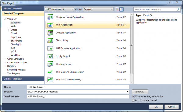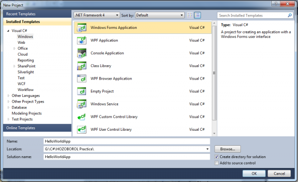 ভিসুয়াল স্টুডিও ওপেন করে File->New Project ক্লিক করুন। এরপর নিচের মতো করে Windows Forms Application select করুন। নিচের ছবির মত প্রজেক্টের নাম দিন HelloWorldApp_.