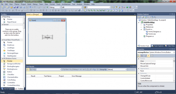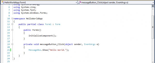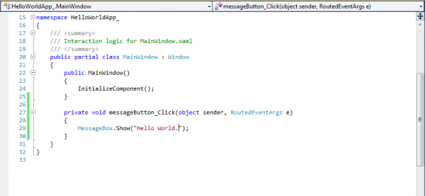 এখন আমাদের কাজ হবে messageButton এ ক্লিক করা মাত্রই একটা মেসেজ বক্সে Hello World লিখাটি দেখাবে। কাজটি করতে হলে প্রথমে ফর্মের উপর থাকা বাটনের উপর ডাবল ক্লিক করুন। ক্লিক করলে আপনি messageButton_Click(object sender, EventArgs e) নামে একটি খালি method দেখতে পাবেন।মেথডটিতে MessageBox.Show() তে আমরা যেই message টি দেখতে চাই তা লিখলাম:
