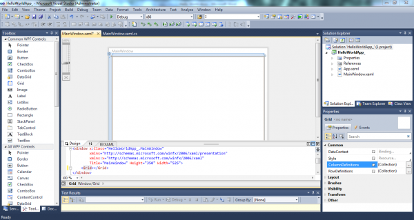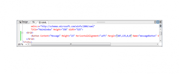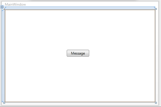 দেখতে অনেকটা Windows Forms Application এর মতো বলে আমি Toolbox আর Properties নিয়ে আপাতত কিছু বললাম না। এখানে আপনি নতুন হিসেবে XAML দেখতে পাবেন। একবারে সহজ করে যদি বলি তাহলে আপনি খেয়াল করে দেখবেন যখন কোনো নতুন কন্ট্রোল আপনি ফর্মে টেনে ছেড়ে দিবেন বা কোনো properties change করেন তাহলে XAML এ পরিবর্তিত কোড দেখতে পারবেন। চাইলে আপনি সরাসরি XAML কোডিং করতে পারবেন। প্রথমেই আমি Toolbox থেকে একটি button টেনে এনে ফর্মের উপর ছাড়লাম। button properties থেকে বাটনের text দিলাম Message এবং বাটনের নাম পরিবর্তন করে দিলাম messageButton. তাহলে নিচের মত UI দেখতে পাবেন।
