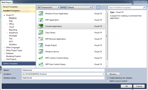 শুরুতেই নতুন একটি প্রজেক্ট তৈরি করতে হবে। ভিসুয়াল স্টুডিও ওপেন করে File->New Project ক্লিক করুন। এরপর নিচের মতো করে Console Application select করুন। প্রজেক্টের নাম দিন HelloWorld. এরপর OK করুন।