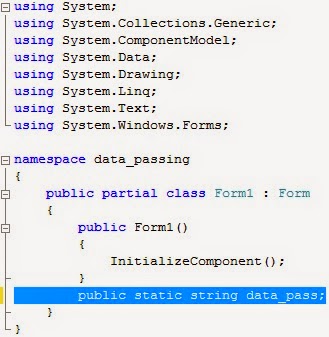 এখন Form1 এর কোড উইন্ডো public static string data_pass; নামের একটি ভেরিয়েবাল ঘোষণা করি।