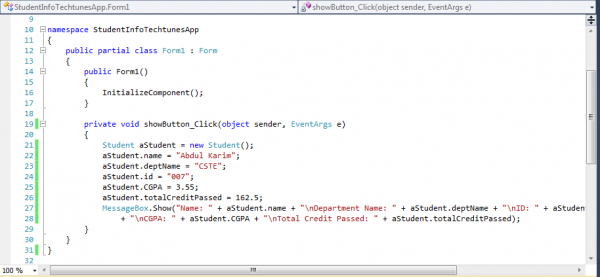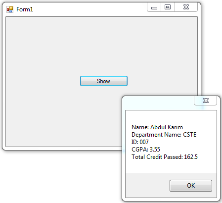 প্রথমেই Student Class এর object create করলাম। এই object এর মাধ্যমে public member গুলোর মান দিয়ে দিলাম। প্রোগ্রামটি রান করিয়ে Show বাটনে ক্লিক করলে নিচের মত আউটপুট পাওয়া যাবে।
