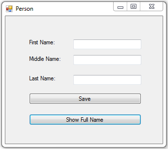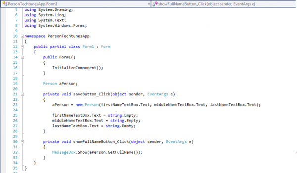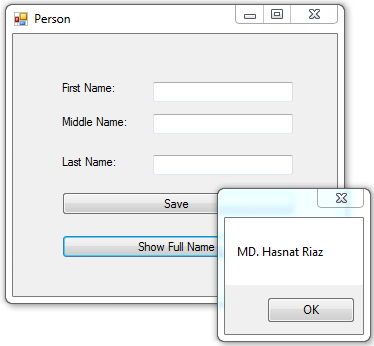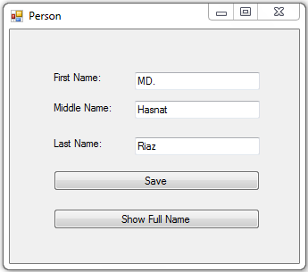 Save এবং Show Full Name বাটনের ক্লিক ইভেন্টে নিচের মতো করে কোড লিখলাম: