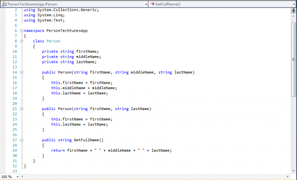 গতপর্বে আমরা User defined Type কি তা আলোচনা করেছিলাম। অল্পস্বল্প কিছু বেসিক কথাবার্তাও বলেছিলাম।গতপর্বে যেই প্রোগ্রামটা দেখিয়েছিলাম সেখানে বুঝানোর সুবিধার্থে Object Oriented এর কিছু rules violate করেছিলাম।এই পর্বে আরেকটি প্রোগ্রাম দিয়ে Object Oriented এর data must be private এই rules দিয়ে কোড করে দেখাবো।শুরুতেই Person নামে নতুন একটা টাইপ বানালাম অর্থাৎ Person.cs নামে একটি ক্লাস নিলাম। ক্লাসের মধ্যে তিনটি private ভেরিয়েবল, দুইটি constructor এবং একটি মেথড নিচের মতো করে লিখলাম।