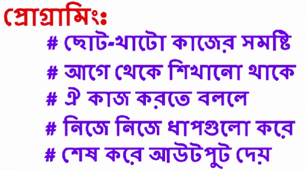 তারমানে, কোন একটা প্রোগ্রাম বলতে আমারা বুঝি, অনেকগুলা ছোট ছোট খুচরা কাজের সমষ্টি যেটা কেউ একজন একবার শিখায় দেয়। পরবর্তীতে, ঐ কাজ করতে বললে, সে একই পদ্ধতিতে সেই কাজ বার বার করতে থাকে। যেমন, লিটন ভাইকে চা বানানোর পদ্ধতি কেউ একজন একবার শিখাই দিছে। এরপর থেকে আজীবন লিটন