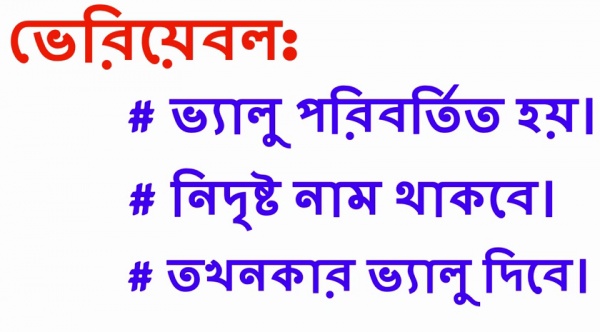 কেউ যদি আপনাকে জিজ্ঞেস করে আপনার বয়স কতো? আপনি হয়তো এখন বলবেন ৬৯, পরের বছর বলবেন ৭০, তারপরের বছর জিজ্ঞেস করলে বলবেন ৭১। এই যে আপনার বয়সটা এইটা কিন্তু পরিবর্তিত বা চেইঞ্জ হচ্ছে। তারমানে এটা বছর বছর ভেরি করতেছে। এই যে বয়সের মান বা value পরিবর্তিত হয়ে যাচ্ছে বা ভেরি করতেছে, তাকে প্রোগ্রামিং এর ভাষায় variable বলে।