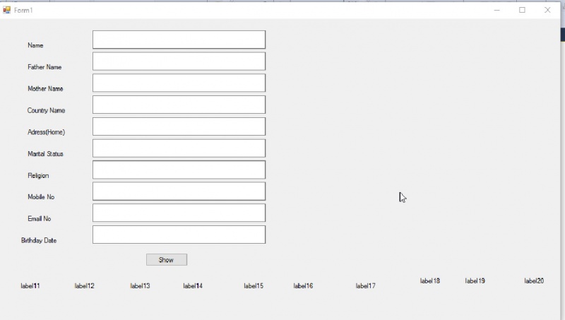তারপর Toolbox থেকে দশটা label নেন সাথে ১০ টা textbox নেন। 1 নাম্বার label এর নামদেন Name,2 নাম্বার label এর নামদেন Father Name,3 নাম্বার label এর নামদেন Mother Name,4 নাম্বার label এর নামদিন Country Name,5 নাম্বার label এর নামদেন Address(Home),6 নাম্বার label এর নামদেন Martial Status,7 নাম্বার label এর নামদেন religion Name,8 নাম্বার label এর নামদেন Mobile No,9 নাম্বার label এর নামদিন Email No,10 নাম্বার label এর নামদেন Birthday date। তারপর একটি Button তৈরী করুন। সবকিছু show করার জন্য। এই Button এর মধ্যে সকল Code লেখা হবে।