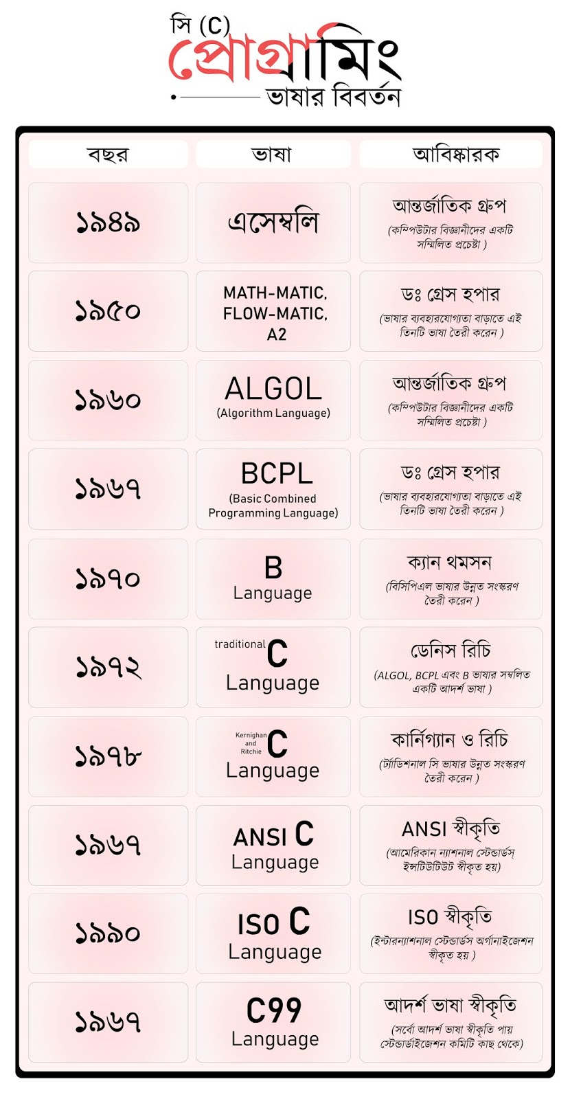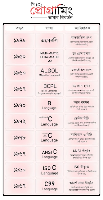 এটি হল সি ভাষার বিবর্তন। আজ কত নতুন নতুন উচ্চতর ভাষা তৈরী হয়েছে। কত বিজ্ঞানীর অঢেল পরিশ্রমে আজকের এই উচ্চতর কম্পিউটার। কত সহজেই না আমরা একে ব্যবহার করতে পারছি। এ কৃতজ্ঞতা একজনের বা কয়েক জনের না। এটা বহু জনের জ্ঞান স্বরূপ বিজ্ঞানের আশির্বাদ।