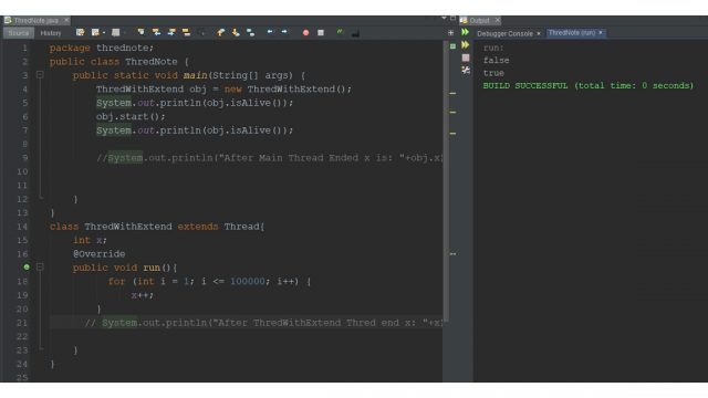 ১নং চিত্রের মধ্যে x এর মান 100000 প্রিন্ট করার কথা, কিন্তু প্রিন্ট করতেছে 0. কারণ আমরা জানি ইন্সট্যান্স ভ্যারিয়েবলের ডিফল ভ্যালু 0. যখন obj.x এর সাহায্যে x এর মান প্রিন্ট করা হচ্ছে তখন x এর মান ডিফল ভ্যালু যেটি ছিল সেটি প্রিন্ট করে দিচ্ছে কারণ ThredWithExtend ক্লাসের লোপটি তখনও চলা শুরু করেনি বা ওই থ্রেডটি তখনও start হয়নি।