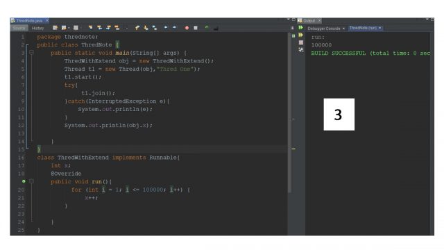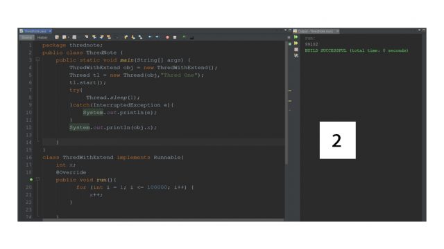 ২নং চিত্রে t1.start মেথডের মাধ্যমে run() মেথডকে কল দেয়া হল। তরপর মেইন মেথডের থ্রডটিকে ১মিলিসেকেন্ড থামিয়ে রাখা হল। ততক্ষনে ThredWithExtend ক্লাসের থ্রেডটি যতক্ষন সময় পেল ততক্ষন লোপটি ঘুরল। obj.x কল হতে হতে x এর মান পরিবর্তন হয়ে গেলে। তাই x এর মান 99102 প্রিন্ট করল। এখানে x এর মান সবসময় এক হবে না। কারণ এটি পিসির কনফিগারেশন এর উপর বা অন্যান্য অনেক বিষয়ের উপর নির্ভর করে।