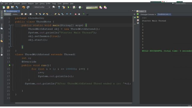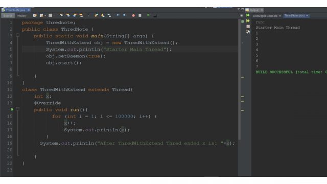 এখানে ১, ২, ৩…. প্রিন্ট করার কারণ হচ্ছে প্রথমে মেইন থ্রেডটি ThredWithExtend এর একটি অবজেক্ট তৈরি করল। অবজেক্ট তৈরি করার পর ThredWithExtend ক্লাসের ট্রেডটিকে ডিমন ট্রেড করে দিল। তারপর run মেথডকে কল দেয়া হল। রান মেথডকে যখন কল দিল তখনও মেইন থ্রেডের নির্বাহ শেষ হয়নি। শেষ হতে হতে run মেথডের ভিতরে ঢুকে প্রিন্ট করা শুরু করল। যখনই Main থ্রেডের কাজ বন্ধ হয়ে গেল সাথে সাথে অন্য থ্রেডটিও বন্ধ হয়ে গেল। মেইন থ্রেড বন্ধ হতে হতে যতক্ষত সময় পেল লুপ ততক্ষন চলল এবং প্রিন্ট করল। এই একই প্রোগ্রাম আবার রান করলে একই মান আসবে না। কারণ এটি পিসির কনফিগারেশন এর উপর বা অন্যান্য অনেক বিষয়ের উপর নির্ভর করে। নিচে একই প্রোগ্রামের আরেকটি করা ছবি দেয়া হল: