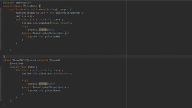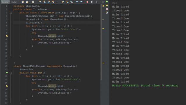 ৬.তারপর ৫০০ মিলিসেকেন্ড ThreadWithExtend থ্রেডটা অফ থাকল। ততক্ষনে সেটি আবার মেইন থ্রেডে ফিরে গেল এবং আবার obj.start() এর মাধ্যমে run মেথডটিকে স্টার্ট করার জন্য কল দেয়া হল। এটি কল হতে হতে obj.start() এর নিচে যে লোপ চালানো হয়েছে সেখানে ঢুকল এবং Main Tread লিখাটি একবার প্রিন্ট করল এবং ৫০০ মিলিসেকেন্ড মেইন থ্রেডটি অফ থাকল।