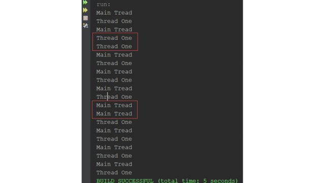 ৫. যখন মেইন থ্রেডটি অফ হয়ে যায় ততক্ষণে obj.start() এর মাধ্যমে যে run মেথডটিকে স্টার্ট করার জন্য কল দেয়া হয়েছিল সেটিতে গেল এবং এখানেও একটি লোপ চালানো হয়েছে সেই লোপের মধ্যে ঢুকে Thread one লিখাটি একবার প্রিন্ট করল।