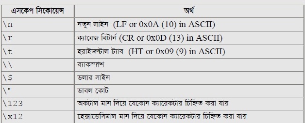 পিএইচপিতে “\” হল এসকেপ ক্যারেকটার। এর সাথে মিলিতভাবে কিছু নির্দিষ্ট ক্যারেকটার এর বিশেষ মান রয়েছে।