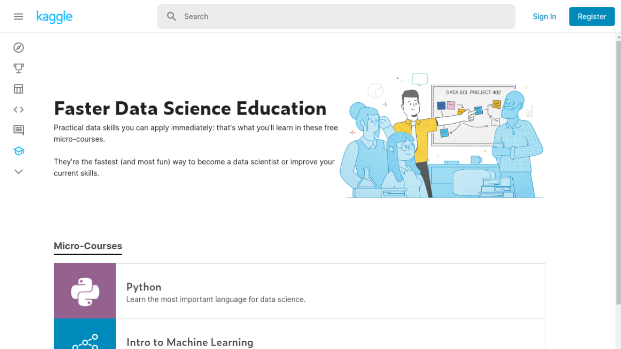 যদি আপনার ডেটা সায়েন্স শেখার প্রতি আগ্রহ থাকে তাহলে Kaggle ওয়েব সাইটে ডেটা সায়েন্সের উপর একটি মাইক্রো কোর্স রয়েছে, আশাকরি আপনার কাছে এই কোর্সটি ভালো লাগবে এবং ডেটা সায়েন্টিস্ট হওয়ার জন্য আপনি আরও একধাপ এগিয়ে যাবেন। এই ওয়েব সাইটে প্রায় ১৪টি সিরিজ ক্লাস রয়েছে আর প্রত্যেকটি সিরিজে ৫-১০টি লেসন রয়েছে। আর ফ্রিতে শিখতে পারা ছাড়াও এর আরেকটি ভাল দিক হচ্ছে, কোন অতিরিক্ত সফটওয়্যার ইন্সটল না করেই আপনি এই কোর্সটি করতে পারবেন।
