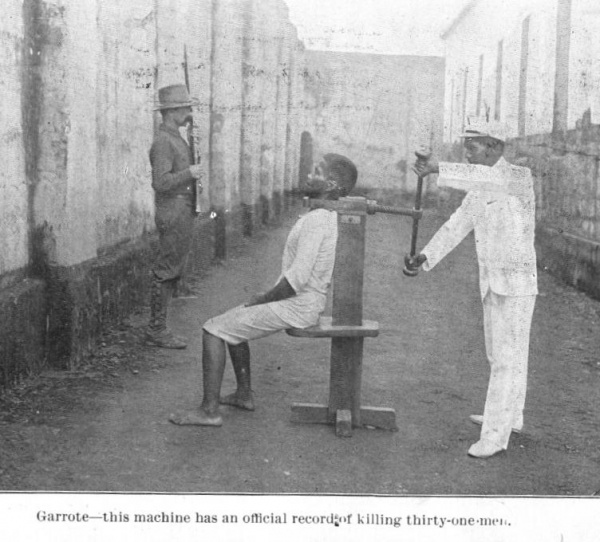 ভিকটিমের ঘাড়ের পিছনে একটি সুচালো স্ক্রু থাকে যেটিকে একটি হ্যান্ডেল দিয়ে ঘুরানো হয়। এর ফলে স্ক্রু টি ভিকটিমের স্পাইনাল কর্ডকে মস্তিস্ক থেকে আলাদা করে দেয়। মৃত্যু নেমে আসে খুব দ্রুত!!!