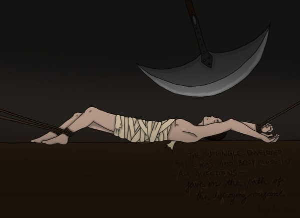নিচে হাত পা বাধা অবস্থায় অপরাধী শুয়ে থাকতো, এবং দেখতো, যে কিভাবে আস্তে আস্তে মৃত্যু তার দিকে নেমে আসছে। শেষ পর্যন্ত ভারী ব্লেডটি আস্তে আস্তে তার বুকের পাঁজর কেটে বসে যেত। প্রচন্ড যন্ত্রনা নিয়ে মৃত্যু হত অপরাধীর।