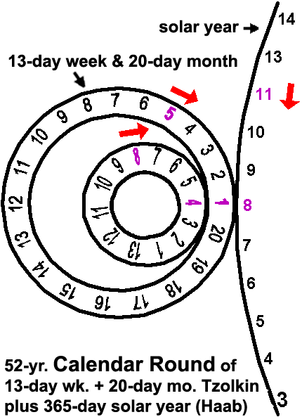 তযোকি’ন ২৬০ দিনের চক্র এবং হা’ব ৩৬০ দিনের চক্র। তযোকি’ন এবং হা’ব একত্রে ১৮.৯৮০ দিনের একটি চক্র পূরণ করে। এই চক্রটি ‘রাউন্ড ক্যালেন্ডার’ নামে পরিচিত। ৫২ সৌর বর্ষের তুলনায় ১৮,৯৮০ দিন খুবই কম।