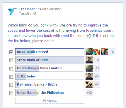 ফ্রিলান্সার ডট কমের ফেসবুক ফ্যানপেজ এ এই ভোট এর পোস্ট টি দেয়া হয়েছে । এখানে যেসব ব্যাংক সবচেয়ে বেশী ভোট পাবে , সেইসব ব্যাংক এ এই সুবিধা ওরা আগে চালু করবে । তাই এখনই ভোট করুন আপনার প্রিয় ব্যাংকটিকে ( আপাতত ব্র্যাক ব্যাংক এবং ডাচ বাংলা ব্যাংক এগিয়ে আছে ) ।