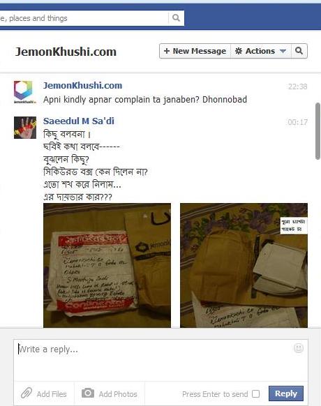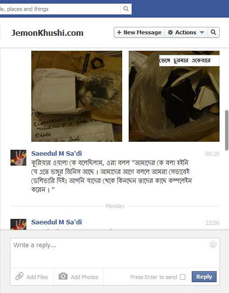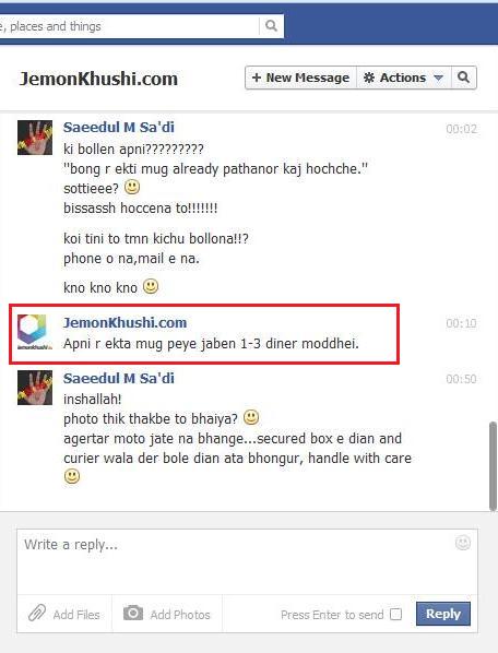 তাড়াতাড়ি প্যাকেট আর ভাঙ্গা mug টার ছবি তুললাম এবং jemonkhushi.com কে মেইল করে পাঠালাম । সাথে তাদের ফেইসবুক পেইজে (http://facebook.com/JemonKhushiBD) inbox করলাম ছবি আর অভিযোগ । ওদের ফ্যান পেইজ থেকে আমাকে বলা হল ২/৩ দিনের মধ্যে আমাকে আরেকটি পাঠান হবে । আর মেইল এ বলা হল ওরা কিছু একটা করার ট্রাই করছে ।