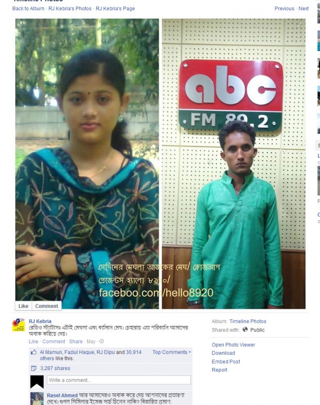দু একটি ফেক আইডি শ্রোতাদের মনে বিভ্রান্তি সৃষ্টি করছে। তাদের জন্যে বলছি, মেঘলার এই মেয়েবেলার ছবি তিন বছর আগের। মেঘলার কথা অনুযায়ী তার এক চাচাত ভাই এই ছবি দিয়ে একটি ফেসবুকে ফেক আইডি খুলেছিলো। আমরা মেঘলার আরো কিছু ছবি ফেসবুকে খুব শীঘ্রই দিয়ে দিব।