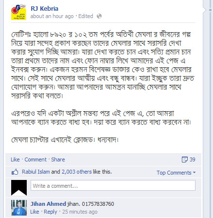 পোস্ট ও ছবি মুছে দেওয়ার পর ছবির ঘটনার কোন সুরাহা না করেই উনি নিজেই মেঘলা চ্যাপ্টার ক্লোজড ঘোষণা করেন । মেঘলার সাথে দেখা করার সুযোগ ও পেইজে ব্যান করার হুমকি দিয়ে নিচের পোস্ট দেনঃ