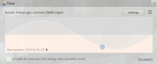 ৭। কম্পিউটার এর ব্রাইটনেস কমিয়ে রাখুন। এতে আপনার চোখের উপর বেশি আলো পড়বে না। এর জন্য F.LUX নামক সফটওয়ার টি ব্যাবহার করলে ভাল হয়। এটি automatically ব্রাইটনেস Adjust করতে পারে । এর Download Link : এখানে বিশ্বাস করুন এটি চরম কাজ করে। একবার ব্যাবহার করেই দেখুন না !