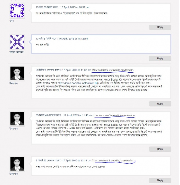 বেশ কিছু কমেন্ট দেখলাম, আমি নিজেও একটি কমেন্ট করলাম। ওমা! একমিনিট পরেই কমেন্ট আনঅ্যাপ্রোভড। ভাবলাম হয়তো কোন ত্রুটি, আবার কমেন্ট করলাম। নাহ! আবারো কিছুক্ষন পরে আনঅ্যাপ্রুভড। অবশেষে আবারো মুল সত্যতা জানিয়ে কমেন্ট করলাম। কিছুক্ষন পরে সেটাও আনঅ্যাপ্রোভড। হায়রে দুনিয়া! সত্য বললেই সর্বনাশ!! নিচে দেখুন তার স্ক্রিন-শট