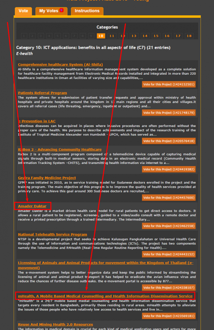 এছাড়া বেসরকারিভাবে তৈরি এমহেলথ প্রকল্পটি এ পর্যন্ত প্রায় ১ কোটি মানুষকে ঘরে বসেই চিকিৎসা সেবা ও তথ্য পাওয়ার সুবিধা দিয়েছে।এছাড়া দেশি অন্যান্য আরও চারটি প্রকল্প মিলে মোট সাতটি প্রকল্পই আন্তর্জাতিকভাবে বিজয়ী হওয়ার যোগ্য। আর এজন্য প্রয়োজন সর্বাধিক সংখ্যক ভোট। তাই বাংলাদেশের তথ্যপ্রযুক্তি খাত বিশ্বের অন্যান্য দেশের তুলনায় দ্রুতগতিতে অনেকাংশে এগিয়ে গেছে এটির স্বীকৃতি পাওয়ার জন্য সকলের উচিত ভোট দেওয়া। তাই আসুন সবাই সম্মিলিতভাবে ভোট দিয়ে আমাদের প্রাপ্য স্বীকৃতি অর্জন করে নিই।