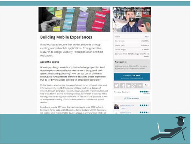 MIT ২০০৬ সাল থেকে মোবাইল অ্যাপ ডেভলপমেন্টের উপর একটা কোর্স চালিয়ে যাচ্ছে। এটার প্রাথমিক লক্ষ্য হল মোবাইল অ্যাপ ইউজারের বিহ্যাবিয়র বোঝা এবং এবং এইগুলো অ্যাপের ডিজাইনে ইমপ্লিমেন্ট করা। এই কোর্সটার সময়কাল হল ১২ সপ্তাহ। এই কোর্সটিতে যেহেতু কিছু কোডিং এর দরকার হয় তাই এই কোর্সটার মাধ্যমে আপনি আসলে মোবাইল ডেভলপমেন্ট কী সেটা ভালভাবেই জানতে পারবেন কোডিং এর দিক থেকে এবং ডিজাইনের দিক থেকেও।