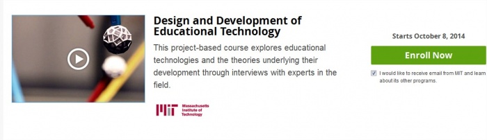 Massachusetts Institute of Technology একটা কোর্স অফর করে যেটা হল Design and Development of Educational Technology। এই সার্ভিসটি বিভিন্ন ইন্টারএকটিভ অনলাইন কোর্স প্রোভাইড করে যেগুলো বিশ্বের বেশ হোমড়া চোমড়া কিছু বিশ্ববিদ্যালয়ে পড়ানো হয়। এই কোর্সগুলো ৬ সপ্তাহের হয়ে তাকেএবং প্রতি সপ্তাহে ৪-৬ ঘন্টা করে ক্লাস করা লাগে। এই কোর্সটি এডুকেশনাল টেকনোলজির ইভোলিউশন এটা কীভাবে সার্বজনীনভাবে ইউজ করা যেতে পারে সেই বিষয়ে আলোকপাত করে।