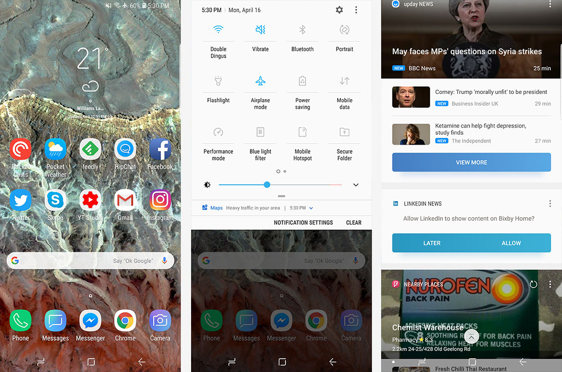 অ্যান্ড্রয়েড ৮.০ এর সকল বেসিক ফিচার আপনি গ্যালাক্সি এস ৯ প্লাসে পাবেন। এছাড়াও স্যামসংয়ে এক্সট্রা হিসেবে পাবেন এডভান্সড মাল্টি উইন্ডো সিস্টেম। আর এস ৮ এর থেকে উন্নত ভয়েস এসিসটেন্স Bixby পাবেন ডিভাইসটিতে। তবে এটাকে পছন্দ না হলে গুগল এসিসটেন্স তো রয়েছেই। এছাড়াও ন্যাভিগেশন এবং স্ট্যাটাস বার কাস্টমাইজেশন, ব্যাটারি, স্টোরেজ এবং পারফরমেন্স মেইনটেন্স সেটিং ফিচার, one-handed মোড সহ অনেক কিছুই পাচ্ছেন আপনি ডিভাইসটিতে। তবে সফটওয়্যার আপগ্রেডের ক্ষেত্রে স্যামসং পিছিয়ে রয়েছে গুগলের ডিভাইসগুলোর থেকে।