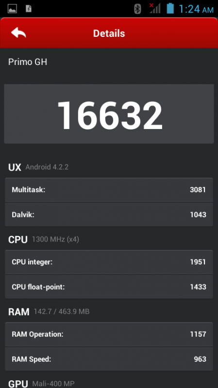 Walton Primo GH তে দেয়া হয়েছে 512 মেগাবাইটের র্যাম। যদিও র্যাম কিছুটা কম মনে হয়েছে কোয়াড কোর প্রসেসর এর সাথে। তবে মজার আর ভাল খবর হল সকল বেঞ্চমার্কিং এপ চালু অবস্থায়ও