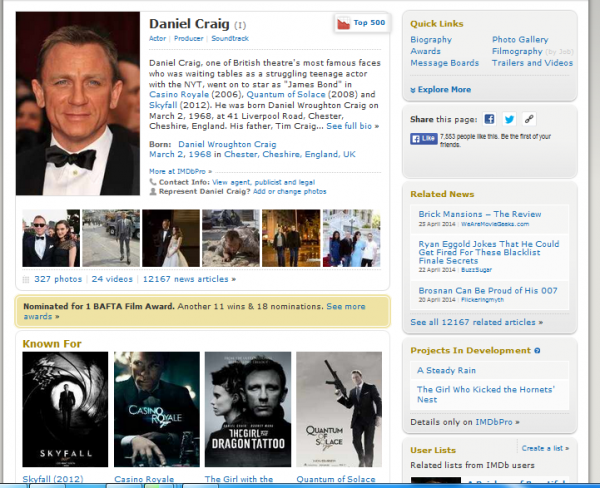 Daniel Craig এর বায়োডাটা। সে কোন ছবি গুলির জন্য বিখ্যাত তার পোষ্টার সহ ছবির নাম বায়োডাটার নিচে দেখুন।