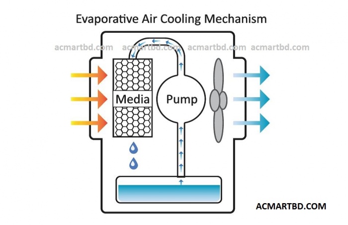 মাধ্যমে বাতাশকে দ্রুত চালনা করা হয়। এর ফলে ঠান্ডা বাতাশ পাওয়া যায়। আজকাল অনেক কুলারের উপরের অংশে বরফ দেওয়ার জায়গা থাকে । ফলে আরও বেশী ঠান্ডা বাতাশ পাওয়া যায়। এই ধরনের এয়ার কুলারের সবচেয়ে বড় সুবিধা হলো এগুলো খুব কম পরিমাণ বিদ্যুত ব্যবহার করে । অর্থাৎ প্রচলিত এসি যেখানে 1600-2000 ওয়াট বিদ্যুত ব্যবহৃত হয় সেখানে একটি এয়ার কুলার 190-230 ওয়াট ব্যবহার করে। ফলে বিদ্যুত খরচ সাশ্রয় । তবে আমি কখনও বলব না যে এয়ার কুলার এসির তুলনায় বেশী ভালো। তবে দাম এবং অন্যান্য দিক ভেবে আমি এই এয়ার কুলারের পক্ষে বলছি। এছাড়া পোর্টেবেল হওয়ার কারনে এই ঘর থেকে ঐ ঘরে সহজে আনা নেওয়া করা যায়। বাজারে বিভিন্ন ব্রান্ডের এয়ার কুলার আপনি পাবেন। এর মধ্যে সিম্ফনি, হানিওয়েল, ইয়ামাদা, ভিডিওকন, উশা অন্যতম। তবে এদের মধ্যে সিম্ফনি এবং হানিওয়েল বেশী বিক্রি হয়।