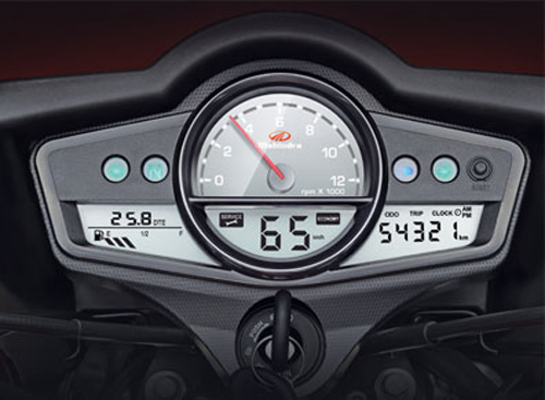 Mahindra Centuro বাইকের ড্যাসবোর্ডটি এনালগ কিনর্তু বেশ সুন্দর ও রূচিশীল । ।বাইকটিতে স্পীডোমিটার , ট্যাকোমিটার , লো ফুয়েল ইনডিকেটর এর সাথে একটা ক্লকও রয়েছে যেটা সাধারণত এই টাইপের বাইকে দেখা যায় না । বাইকটি ডিজাইন অফিসগামী এবং মধ্যবয়স্কদের জন্য খুব শোভনীয়।আসুন বাইকটির ফিচারগুলো জেনে নিই।