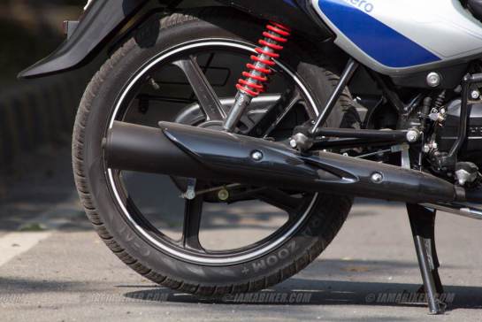বাইকটিতে ১৮ ইন্চির চাকা রয়েছে যেটা ১০০ সিসির বাইকের জন্য যথেষ্ঠ । এর সামনের টায়ারের সাইজ 2.75 X 18 – 4 PR এবং পেছনের টায়ারের সাইজ 2.75 X 18 – 6 PR । বাইকটির একটা বিশেষত্ব হল বাইকটির ২ টা টায়ারই টিউবলেস যেটা সাধারণত ১০০ সিসির বাইকের ক্ষেত্রে দেখা যায় না ।
