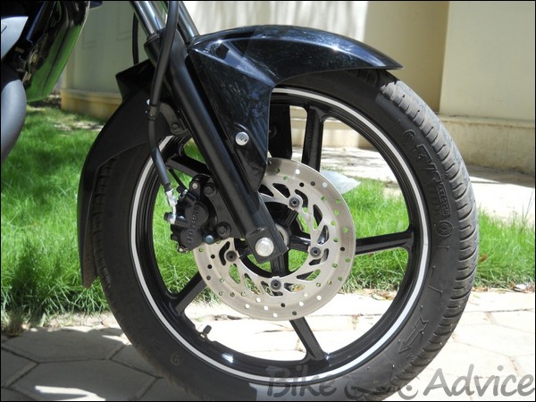 বাইকটিতে ১৭ ইন্চি সাইজের চাকা রয়েছে । এটার সামনের টায়ারের সাইজ হল 2.75- 17 41P এবং পেছনের টায়ারের সাইজ হল 100/90-17 55P । এটার টায়ারের সাইজ আর একটু মোটা হলে মনে হয় ভাল হত । কারণ বাইকটি ১৫০ সিসির ।