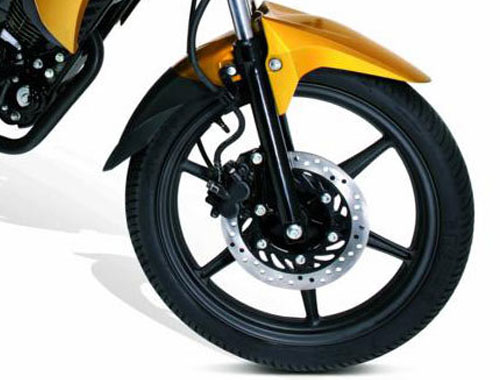 বাইকটির চাকার সাইজ হল ১৭ ইন্চি । সামনের টায়ারের সাইজ 70/100-17/M/C/40P এবং পেছনের টায়ারের সাইজ 80/100-17/M/C/53P । এটার টায়ার দুটি আমার কাছে একটু অমানানসই মনে হযেছে । অনন্ত পেছনের টায়ারটা একটু ভাল মানের দেওয়া উচিৎ ছিল ।