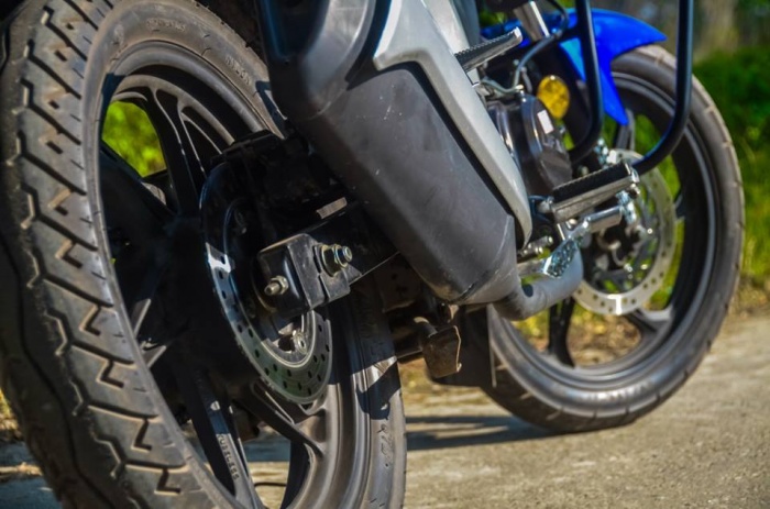 বাইকটির চাকা অন্যান্য ১৫০ বাইকের তুলনায় বেশ মোটা এবং ডিফারেন্ট শেপের। এর চাকাগুলো অ্যালয় এবং টিউবলেস।। বাইকটির সামনের চাকাতে এবং পেছনের চাকাতে ডিস্ক ব্রেক রয়েছে যেটা বাংলাদেশের ম্যাক্সিমাম ১৫০ বাইকেই পাওয়া যায় না।ফলে বাইকটির কন্ট্রোলিংটাও অনেক ভাল। এটা টপ স্পীডে খুব সামান্য মাত্রায় ভাইব্রেট করে থাকে।। বাইকটির হুইলবেস ১৩৩০ মি.মি যেটা বেশ ভালই এবং ১২৫ বাইক এত বেশী সাধারণত থাকে না। বাইকটির গ্রাউন্ড ক্লিয়ারেন্স ১৬০ mm এবং ওজন ১৩৫ কেজি। ওজন একটু বেশী হবার কারণে বেশী স্পীডে ভাইব্রেশনের সমস্যাটা এই বাইকে নেই।আর হাই গ্রাউন্ড ক্লিয়ারেন্স এর কারণে বাইকটি যেকোন রোডে রাইড করে মজা পাওয়া যায়। বাইকটির সামনে সাসপেনশন টেলিস্কোপিক ফর্ক এবং পেছনের সাসপেনশন সিস্টেম হল মনো শক এববজরভার।। বাইকটিতে এ্যলয় হুইলেরর সাথ সামনের চাকাতে ডিস্ক ও পেছনের চাকাতেও ডিস্ক ব্রেক যুক্ত রয়েছে যেটা বাইকটিকে অনেক ভাল কন্ট্রোল এনে দিয়েছে। সামনের টায়ারের সাইজ 2.50-17 এবং পেছনের টায়ারের সাইজ 2.75-17 যেটা ১৫০ বাইকের তুলনায় বেশ মোটা এবং এই চাকার শেপের কারণে বাইকটি নিয়ে কর্নারিং এর ক্ষেত্রে এক্সট্রা অনেক সুবিধা পাওয়া যায়।।এটার অ্যালয় হুইলগুলো বেশ স্টাইলিশ ও স্ট্রং এবং সামনের চাকার হাইড্রোলিক ডিস্ক ব্রেকের সাথে বাইকটি বেশ ভালই লুক নিয়েছে।