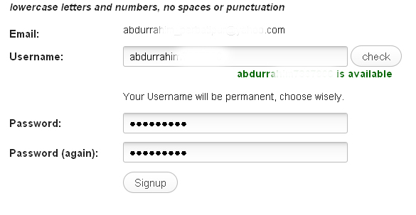 একটি নতুন ট্যাব ওপেন হবে। সেখানে আপনার ইউসারনেম এবং পাশওয়ার্ড দিন। পাশওয়ার্ড দেওয়ার সময় মনে রাখবেন পাশওয়ার্ডটি যেন লেটার এবং নাম্বার এ দুটির কম্বিনেশনে থাকে। ইউসার নেম জাচাই করার জন্য Check বাটনে ক্লীক করুন। নাম ফাকা থাকলে সবুজ রংয়ে available দেখাবে। সবশেষে "Sign up" বাটনে ক্লীক করুন।