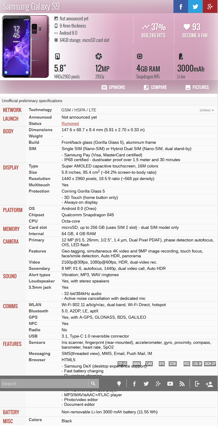 এ বছরই গ্যালাক্সি সিরিজে নতুন স্মার্টফোন এস ৯ ও এস ৯ প্লাস আনার বিষয়টি নিশ্চিত করেছে দক্ষিণ কোরিয়ার প্রতিষ্ঠান স্যামসাং। ২৫ ফেব্রুয়ারি এ দুটি স্মার্টফোন উন্মুক্ত করার জন্য আমন্ত্রণপত্র পাঠিয়েছে। এস ৯ স্মার্টফোনটিতে থাকতে পারে ৫ দশমিক ৮ ইঞ্চি মাপের ডিসপ্লে। কোয়ালকম স্ন্যাপড্রাগন ৮৪৫ প্রসেসর ব্যবহৃত হবে এতে।