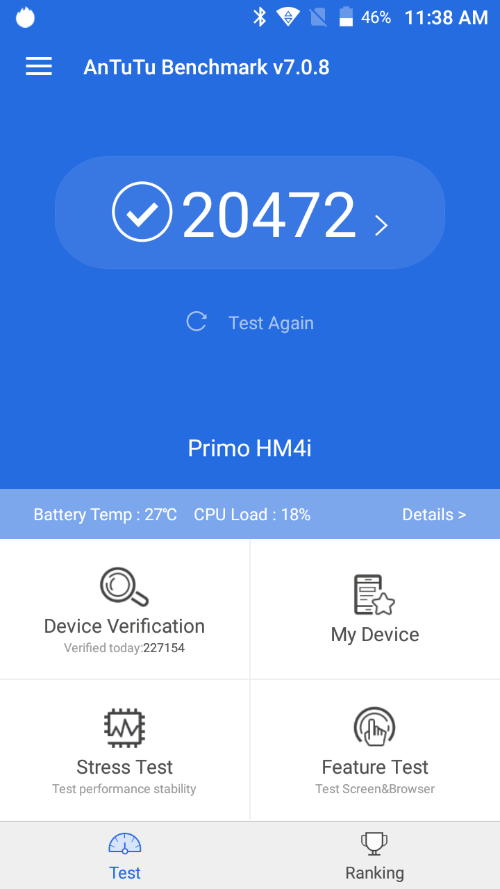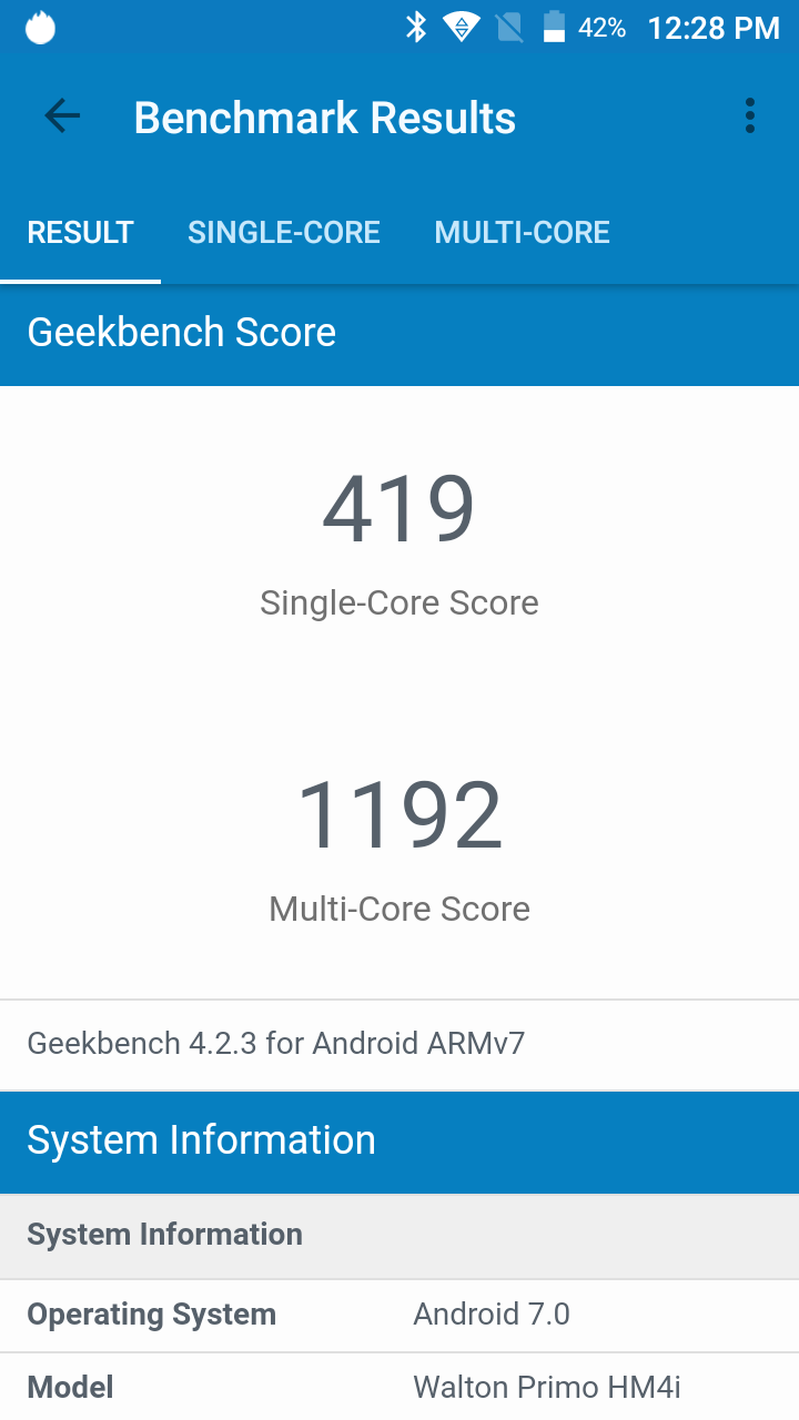 গীগবেঞ্চ অ্যাপে সিঙ্গেল কোরে ডিভাইসটির স্কোর এসেছে ৪১৯। আর মাল্টি কোরে এর স্কোর এসেছে ১১৯২। স্পেসিফিকেশন হিসেবে বেঞ্চমার্ক স্কোর এভারেজ। আর এনটুটু বেঞ্চমার্কে এর স্কোর এসেছে ২০৪৭২।