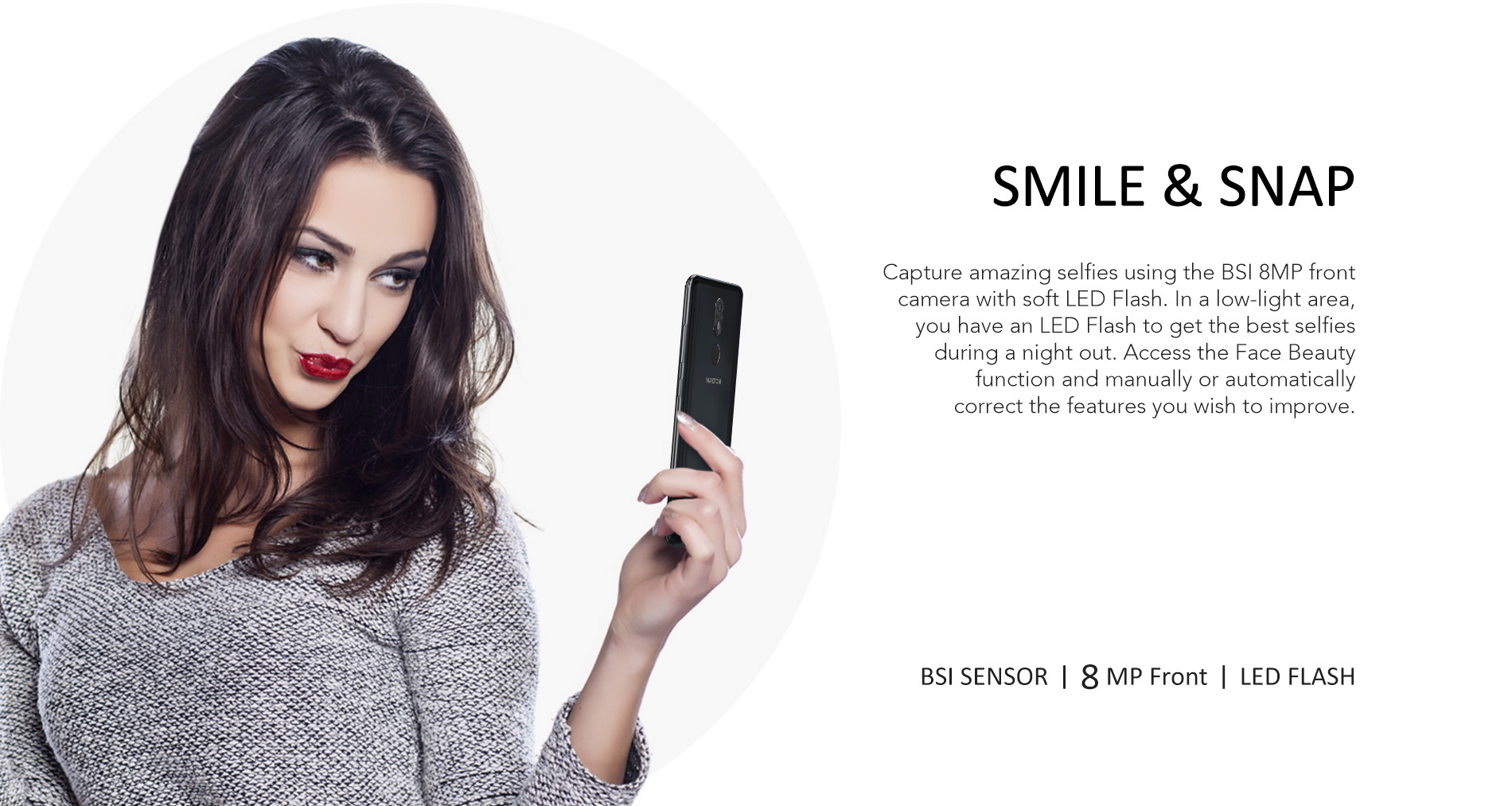 সেলফি প্রেমীদের জন্য ডিভাইসটির ফ্রন্ট প্যানেলে রয়েছে বিএসআই সেন্সর বিশিষ্ট ৮ মেগাপিক্সেল ফ্রন্ট ক্যামেরা। অসাধারন সেলফি তোলার জন্য ক্যামেরাটির সাথে আছে একটি সফট এলইডি ফ্ল্যাশ। যার মাধ্যমে কম আলোতে, এমনকি রাতেও আপনি নিতে পারবেন দারুন সেলফি। আর আপনার সেলফি ইম্প্রুভিং এর জন্য ফেস বিউটি ফাংশন আপনার ছবির আকর্ষণীয়তা বাড়াতে ব্যাপক সাহায্য করবে।
