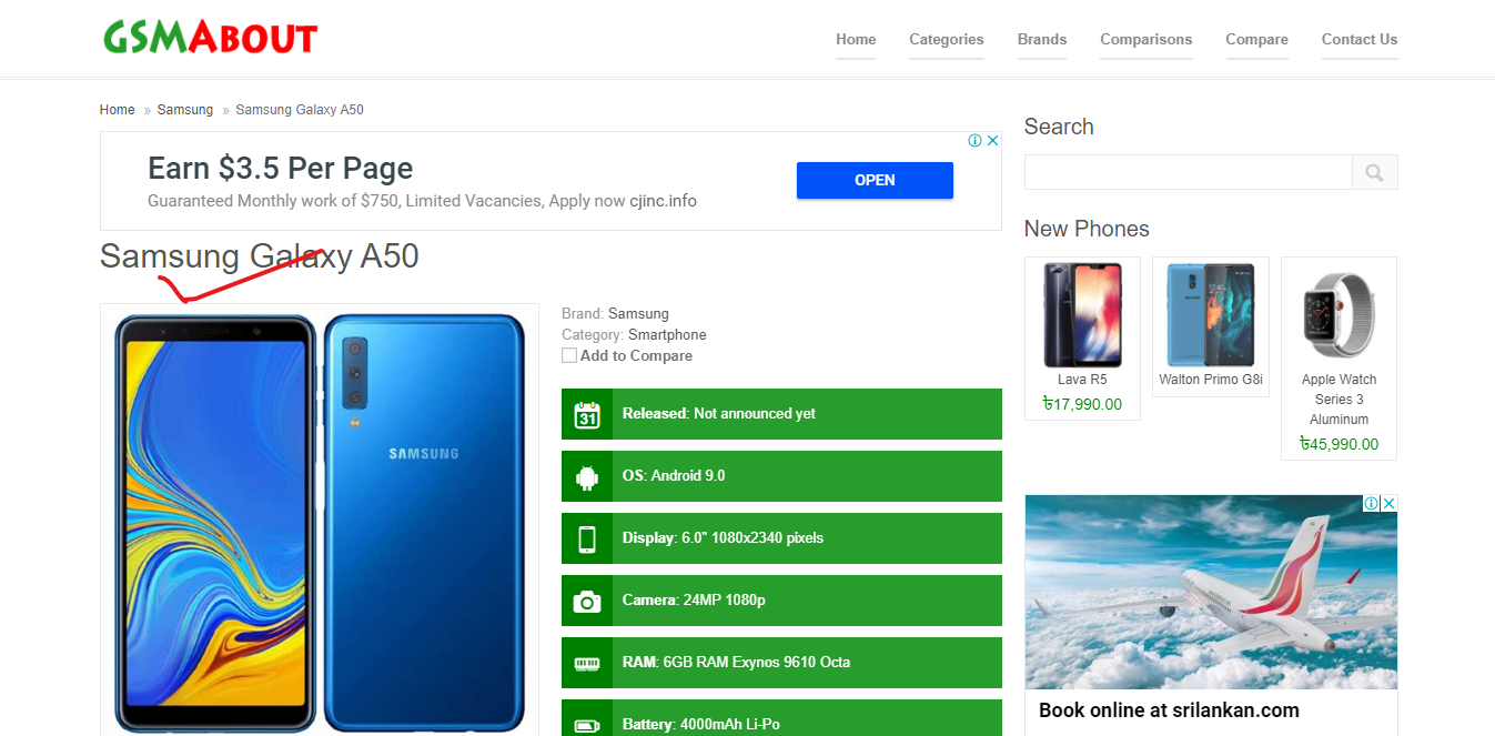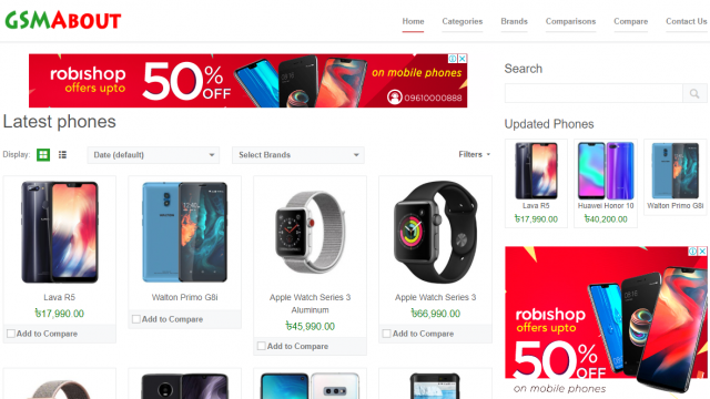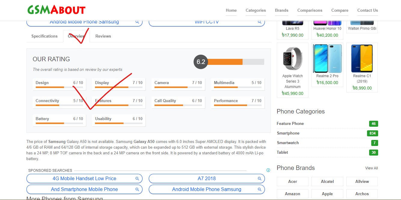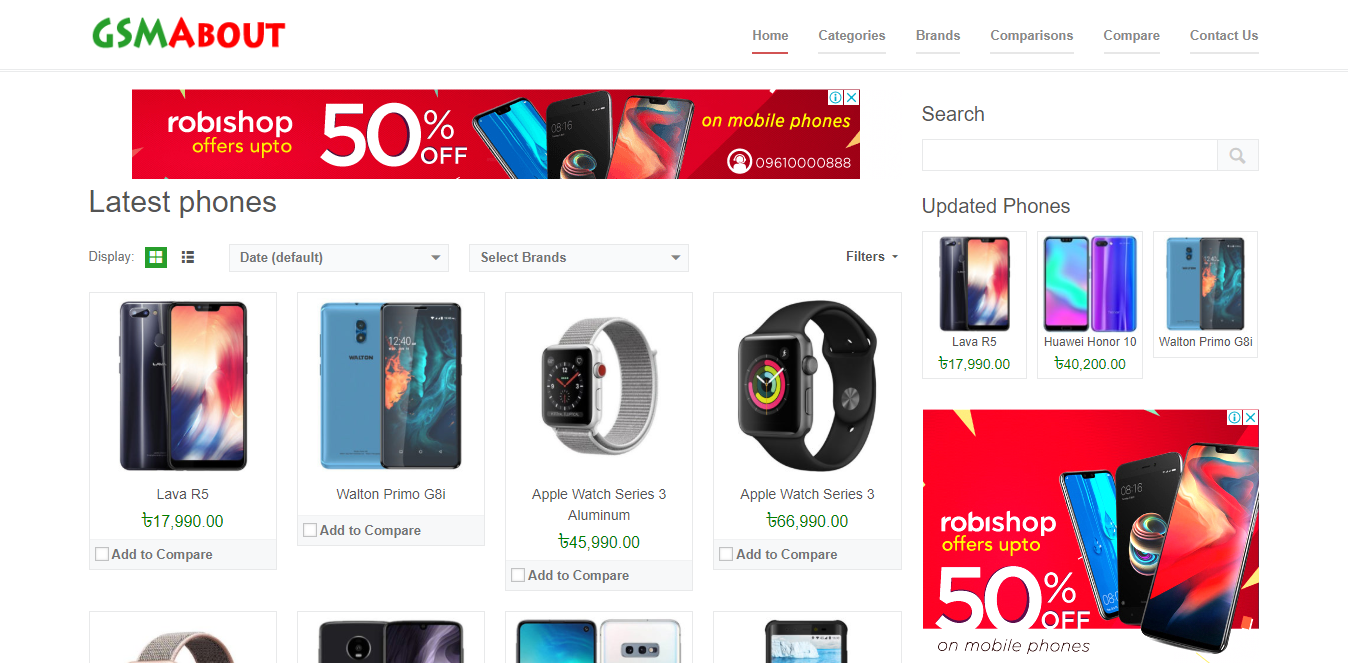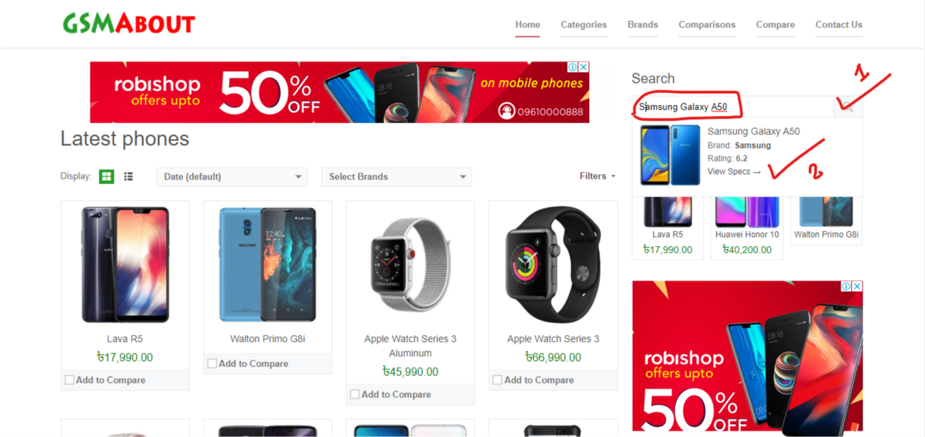 ২. উপরের মত পেজ আসার পর আপনাকে দান পাশে কোনের দিকে সার্চ বাক্স দেখতে পাবেন। আপনি যে মোবাইল ফোন এর দাম দেখতে চান সে ফোন এর নাম লিখুন যেমন Samsung Galaxy A50 এরকম লেখার সাথে সাথে নিছে রেজাল্ট দেখতে পারবেন।