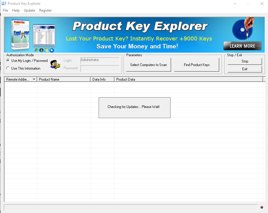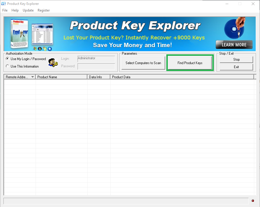 প্রথমে Product Key Explorer এর অফিশিয়াল ওয়েবসাইট থেকে ফ্রিতে এই সফটওয়্যারটি ডাউনলোড দিয়ে ইন্সটল করে নিন। নিচের মত একটি ইন্টারফেস দেখতে পাবেন।