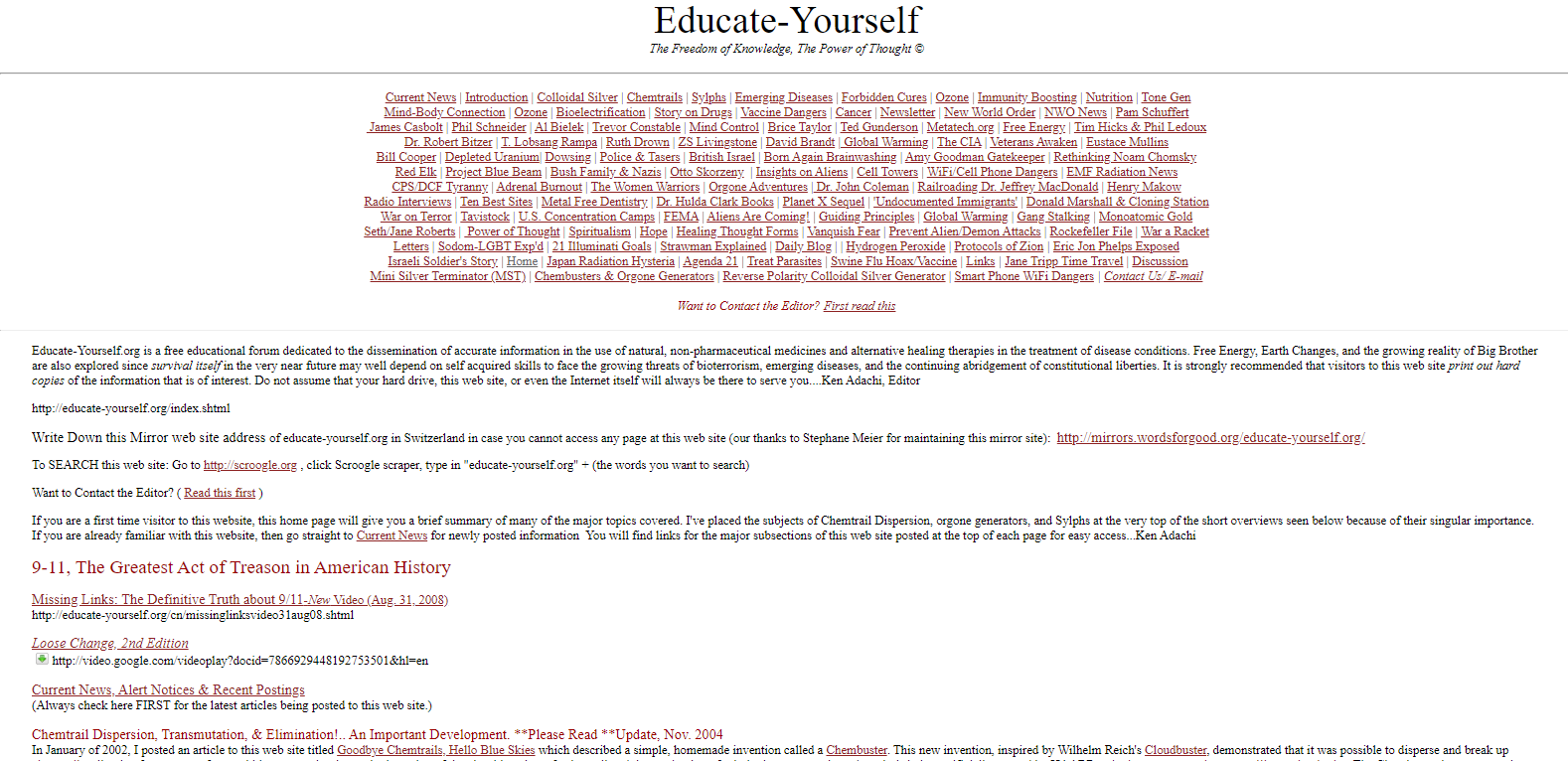Educate Yourself, খুবই সাদামাটা একটি ওয়েবসাইট যেখানে আপনি বিভিন্ন কন্সপাইরেসি থিউরি পেতে পারেন। এই ওয়েবসাইটের সকল থিউরি হোম পেজে প্লেইন টেক্সটে পেয়ে যাবেন। ডিটেল পড়তে চাইলে যেকোনো একটি থিউরিতে ক্লিক করলেই হবে। এখানে আপনি, 9/11 truth, Chemtrails, insights on aliens, Illuminati goals, new world order, global warming, এর মত থিউরি গুলো পড়তে পারবেন।