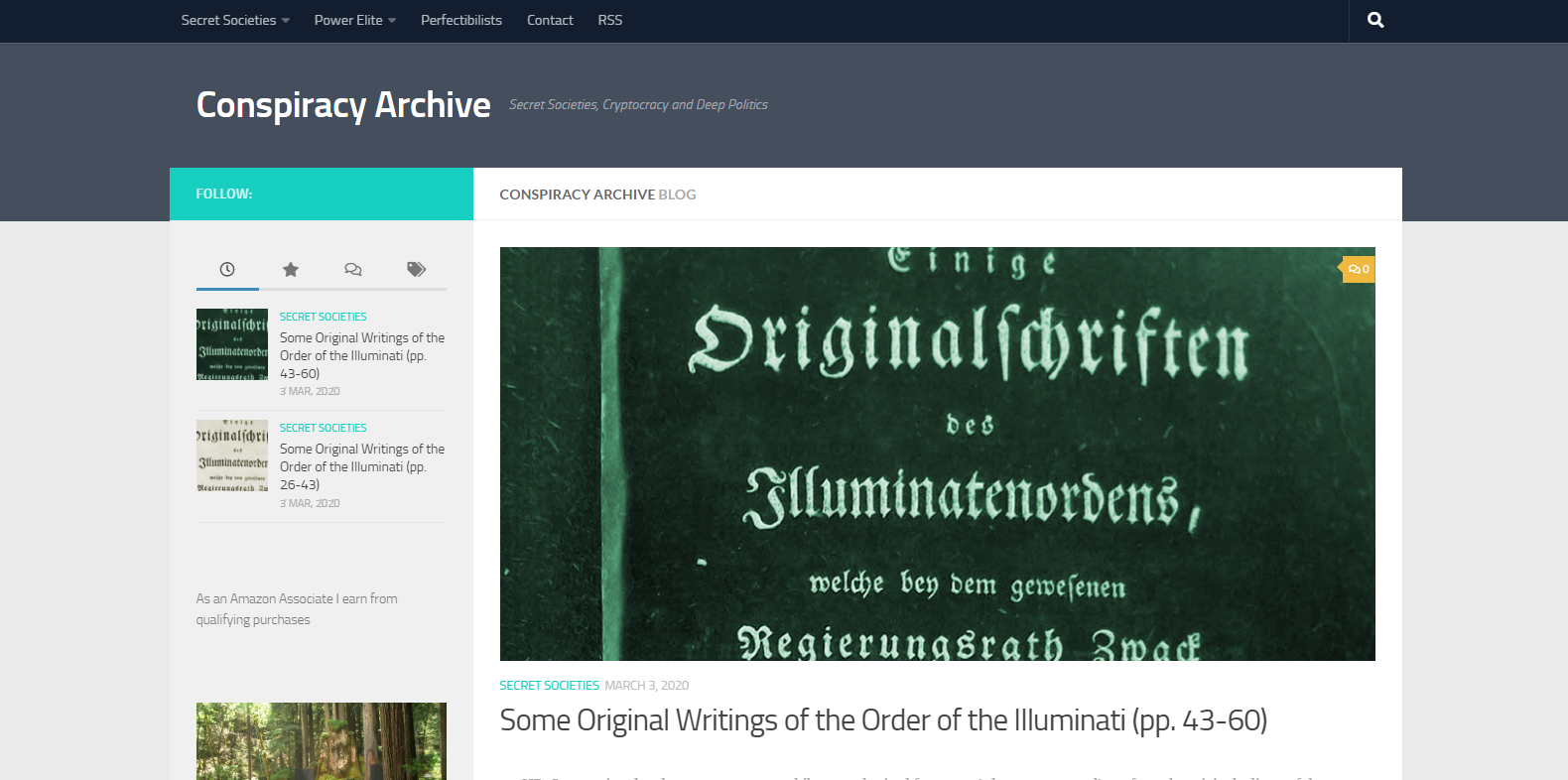 Conspiracy Archive ষড়যন্ত্র তত্ত্ব এর উপর ২য় ওয়েবসাইট। এখানে বিভিন্ন গোপন সংঘ, রাজনৈতিক, বিশ্বায়নের তথ্য পাবেন৷ এই ওয়েবসাইটে বিভিন্ন বিষয়ের উপর আর্টিকেল পাবেন যেখানে প্রায় সকল ফিল্ডই কাভার করা হয়েছে। এই ওয়েবসাইটে আরও পাবেন, scientific dictatorship, new world order, population control, power elite, deep politics, নামের বিভিন্ন ক্যাটাগরি।