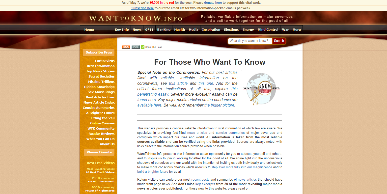 কন্সপাইরেসি থিউরির উপর তৈরি একটি ওয়েবসাইট হল Want to Know। এখানে এমন কিছু ষড়যন্ত্র তত্ত্ব দেয়া আছে যেগুলো হয়তো আপনি জানেন অথবা জানেন না। ওয়েবসাইটটি উদ্দেশ্যমূলক-ভাবে কন্সপাইরেসি বা ষড়যন্ত্র শব্দটি ব্যবহার করে, কারণ তারা বিশ্বাস করে যে লোকেরা ষড়যন্ত্র শব্দটি শোনার সাথে সাথে যাচাই করতে চাইবে ঘটনাটি সত্য নাকি মিথ্যে। আপনি এই ওয়েবসাইট থেকে সকল ষড়যন্ত্র তত্ত্ব জানতে পারবেন চাইলে আপনার ও মতামত জানাতে পারবেন।