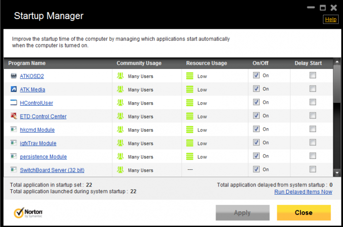 এছাড়াও নরটন ইন্টারনেট সিকিউরিটি ২০১২-তে রয়েছে স্টার্টআপ ম্যানেজার যার মাধ্যমে আপনি কোন কোন প্রোগ্রাম কম্পিউটার চালু হওয়ামাত্রই রান করতে চান এবং কোন কোন প্রোগ্রাম একটু দেরিতে রান করতে চান তা ঠিক করে দিতে পারবেন। এক কথায়, সিস্টেম ইউটিলিটি হিসেবেও নরটনের নতুন সংস্করণকে মাঝে মাঝে কাজে লাগাতে পারবেন।